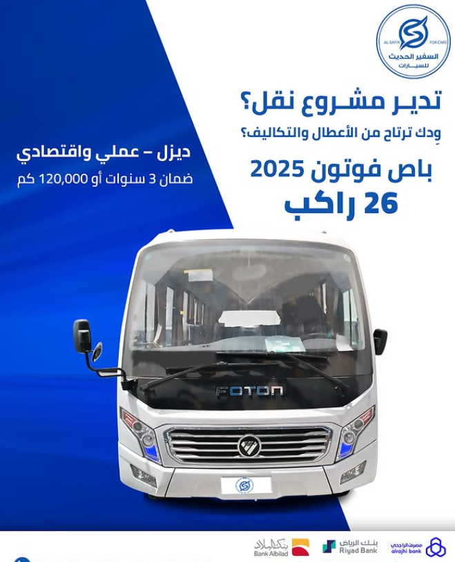 مع السفير الحديث للسيارات، الوكيل المعتمد لشركة فوتو وغيرها من العلامات، وفرنا لك باصات كبيرة بمواصفات عالية وأسعار منافسm